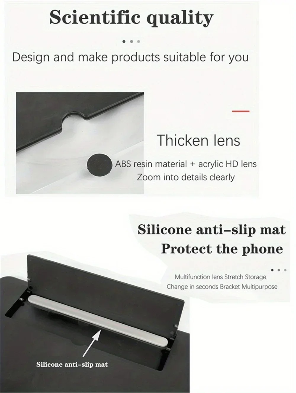 4. High quality materials: ABS plastic and Acrylic, strong and durable, even higher definition. Raise frame adjustable angle of view. Non slip silicone pad protects and stabilizes the phone.