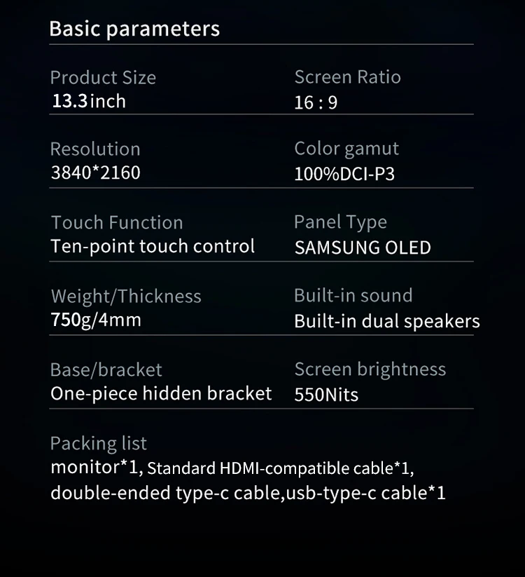 – Item: 13.3 inch 4K AMOLED UHD Portable Monitor