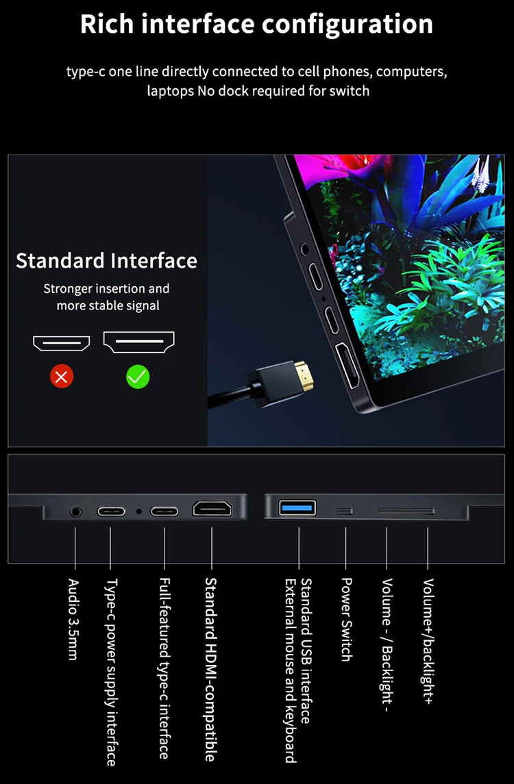 – Interface 1: 1*Standard Hdmi-Compatible, 1*USB Type-A 2.0, 1*3.5mm Aux