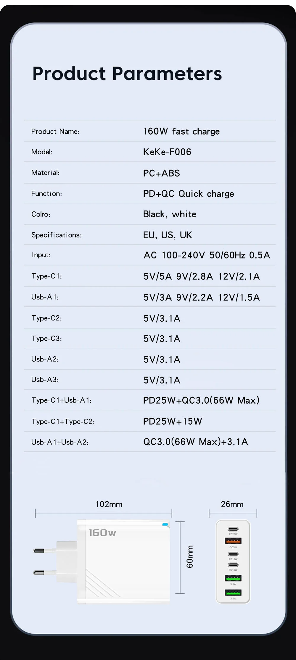 160W Multi-Port USB Type-C Charger with Fast Charging for iPhone, Samsung, and Huawei – EU/US Plug Wall Adapter