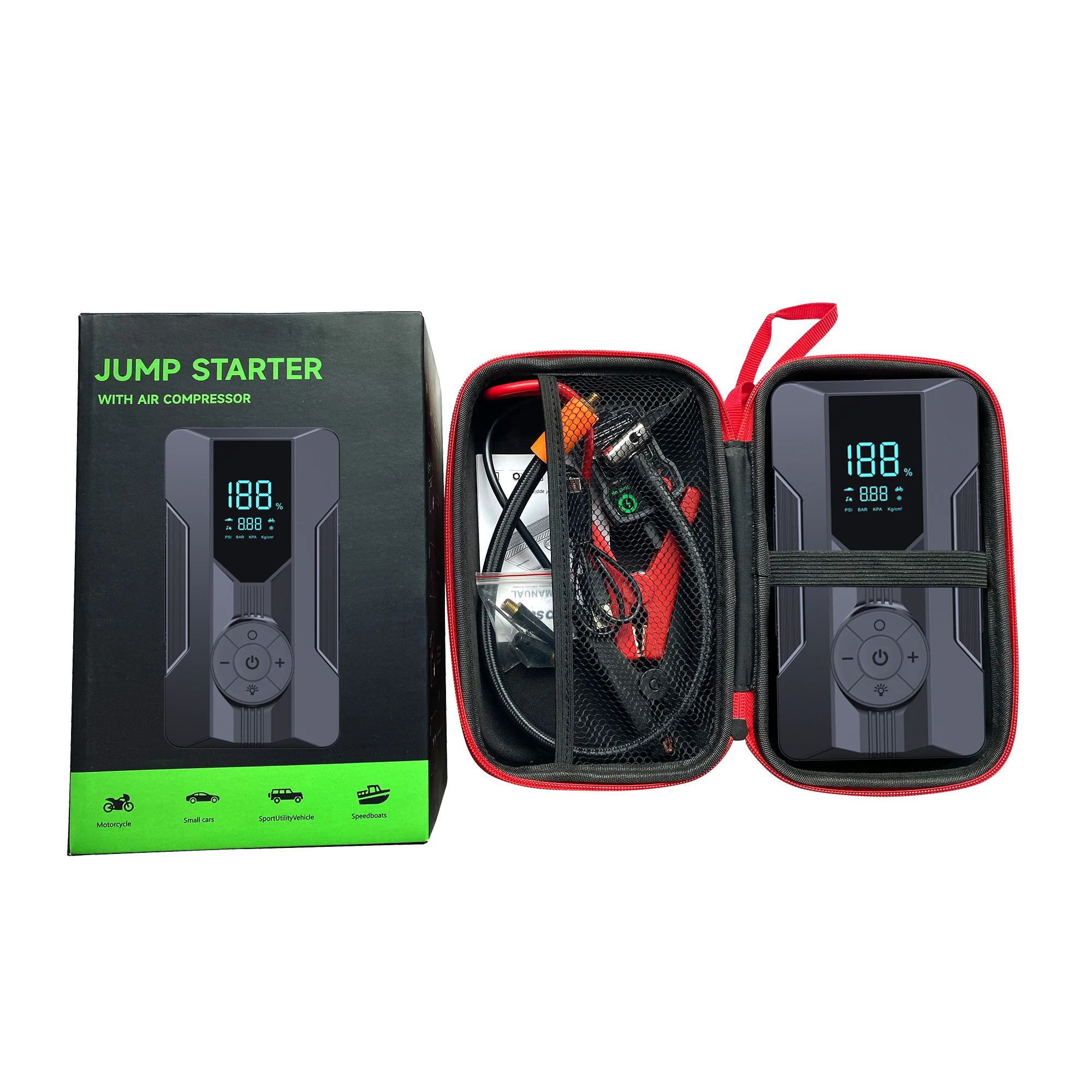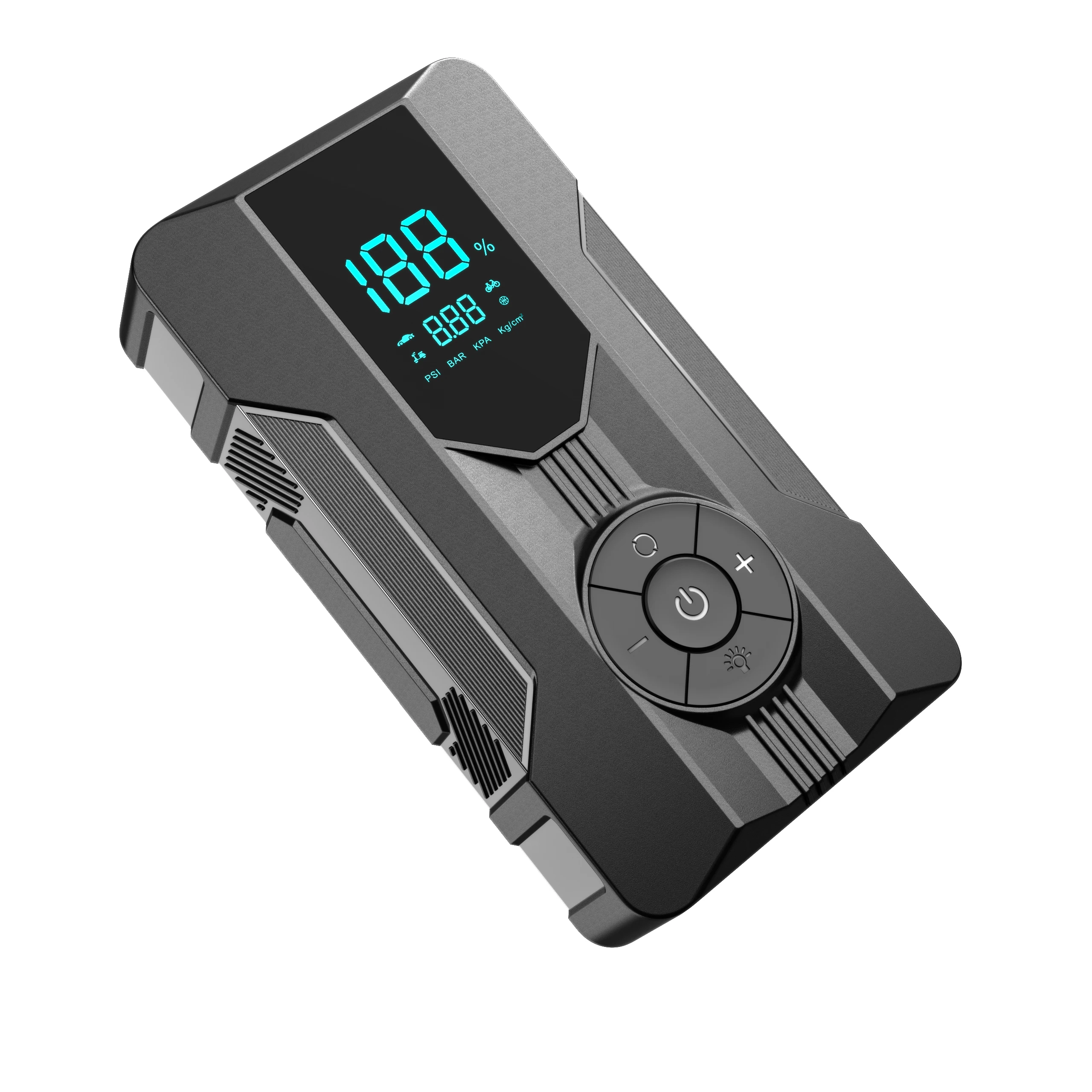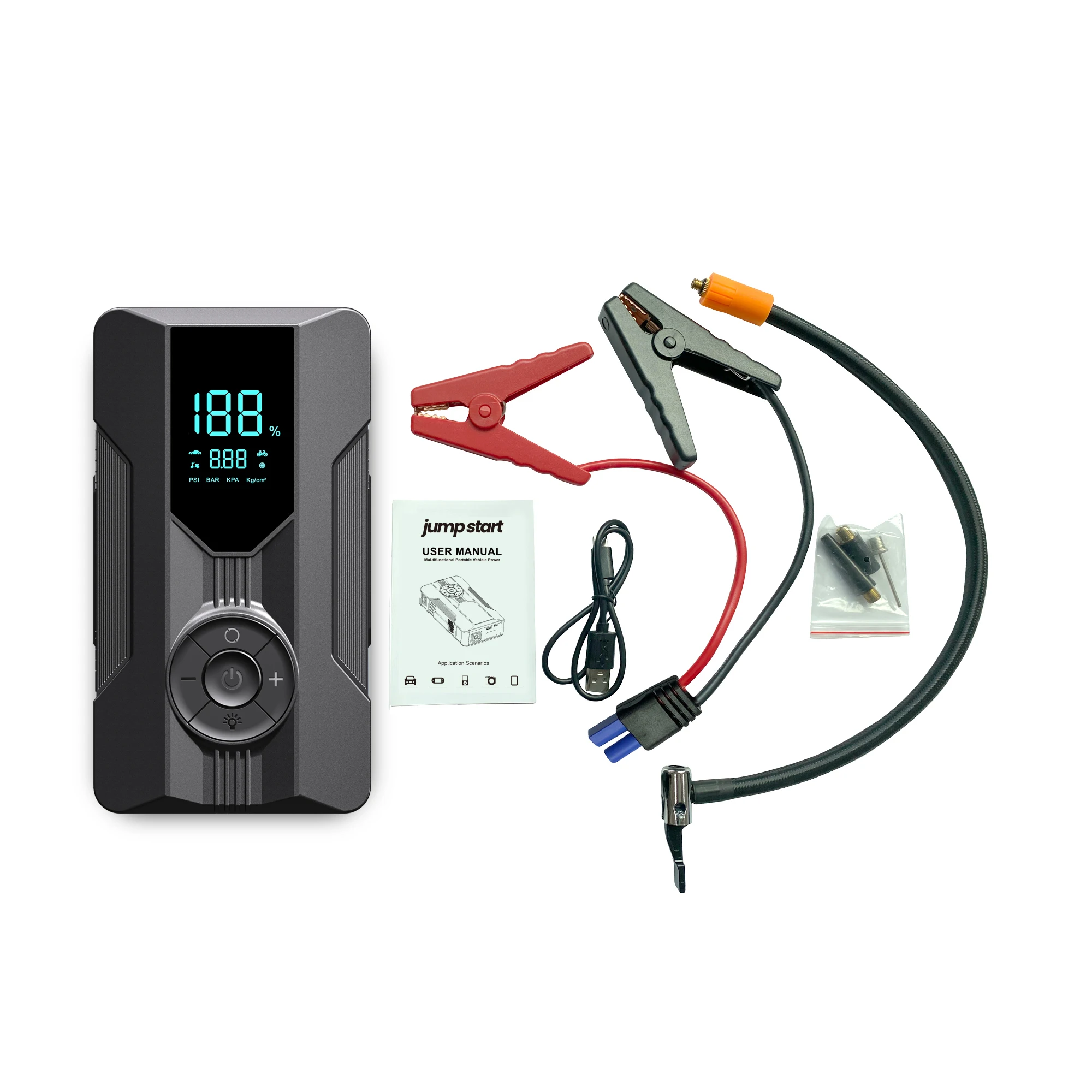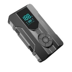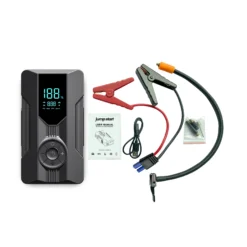 – Portable car jump starter and power bank with air pump functionality.