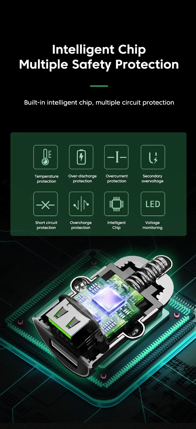 *Built in dual core intelligent recognition chips, the two cores output 100W fast charging current respectively, making it a safe, high-speed, and non-destructive fast car charger for devices. Note: Supports simultaneous charging of two devices, but does not support simultaneous ultra fast charging.