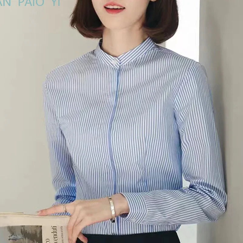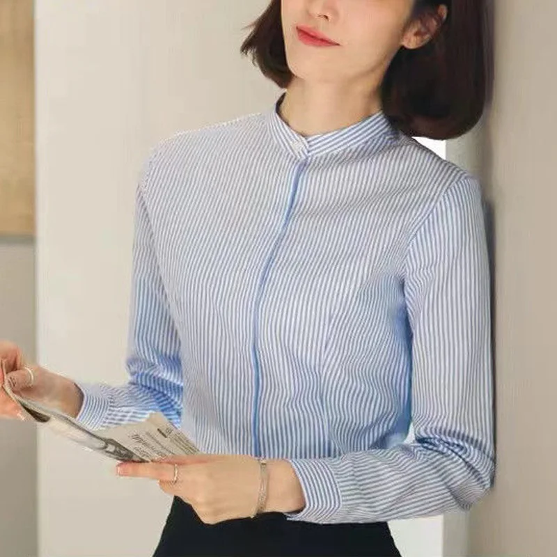 2023 New Spring and Autumn Commuter Simple Striped Standing Collar Anti Glare Snap Three Quarter and Long Sleeve Women’s Shirt