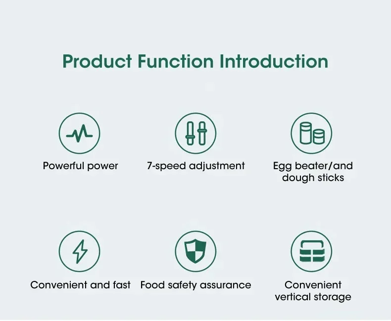 2. Double mixing heads, dough hooks, convenient for mixing and kneading, saving time and effort. The 2-wire mixer is suitable for fluffy whipped cream, perfect frosting, and cakes with whipped egg whites.