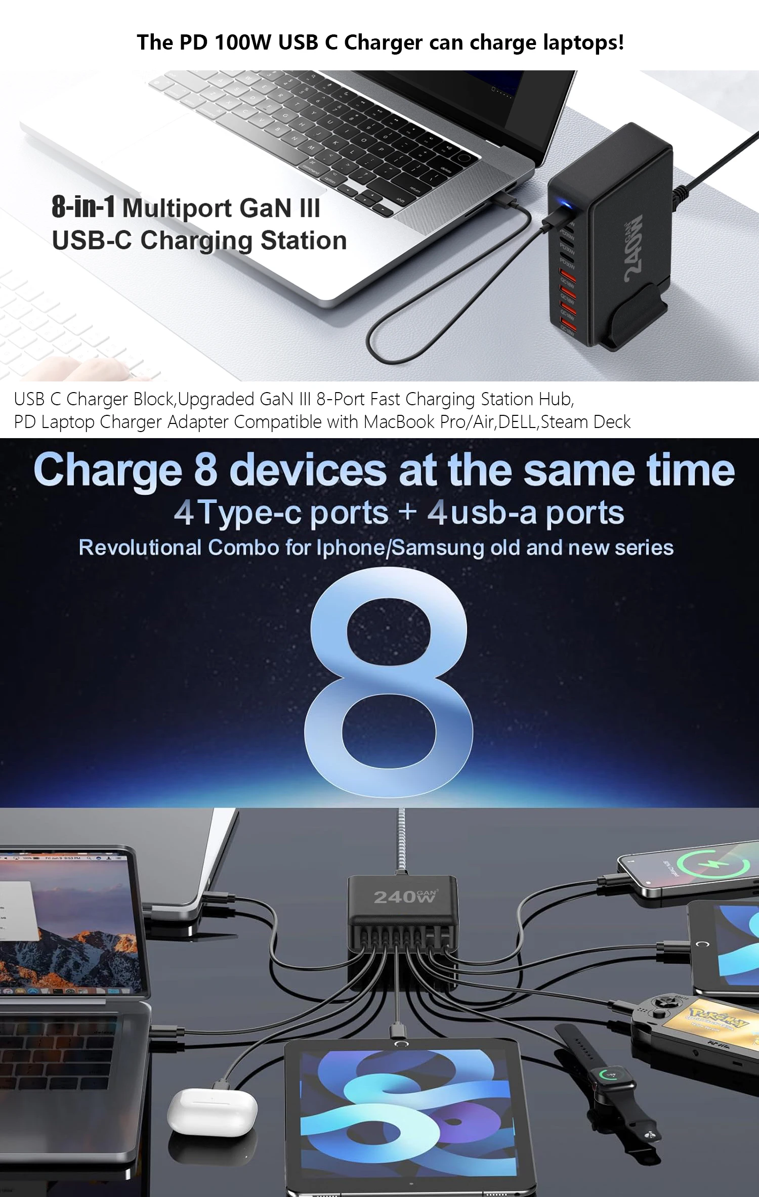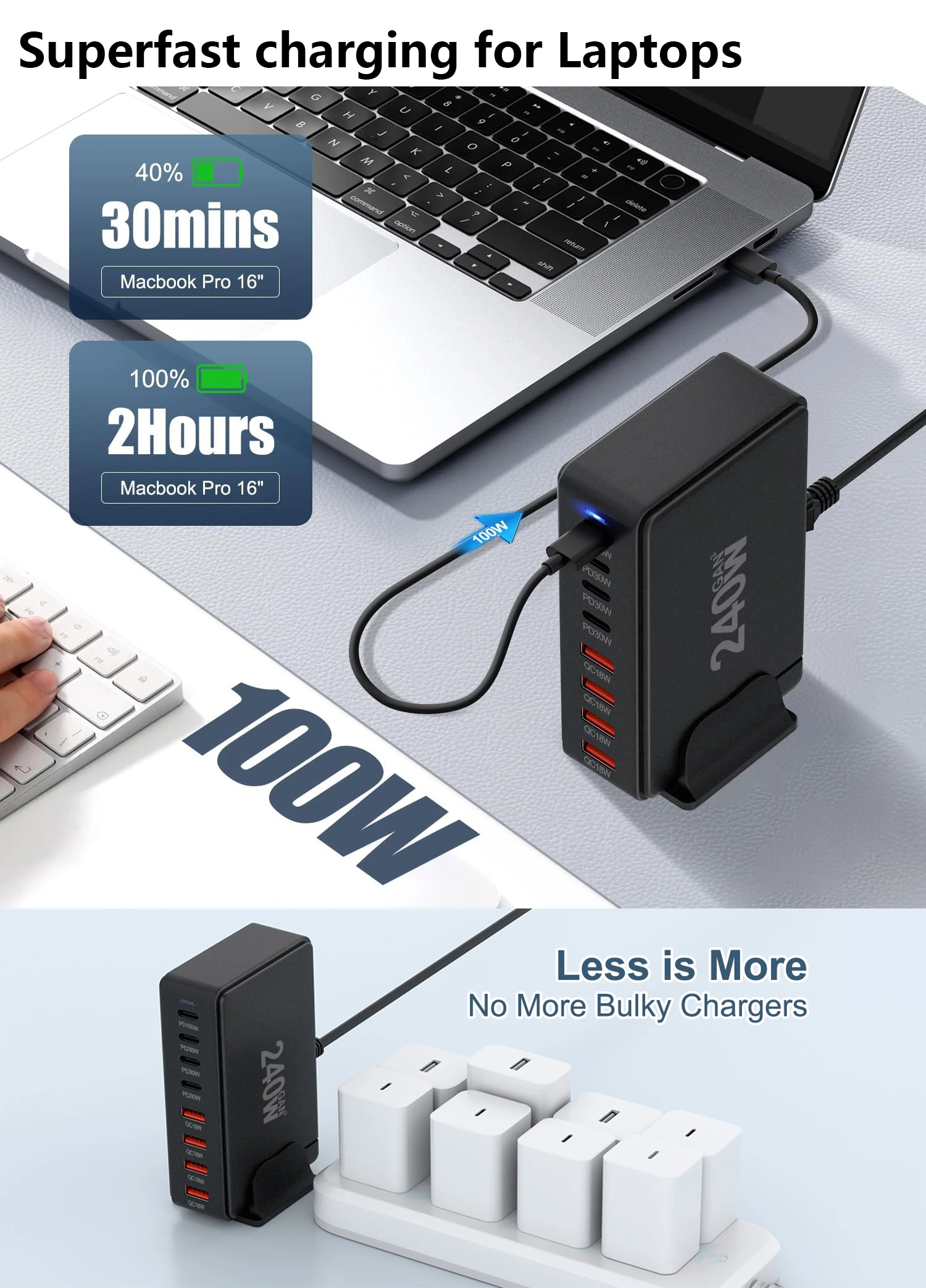 240W fast charging block, 6-port charging station suitable for iPhone/iPad/MacBook, 4C2A PD GaN charger box, USB tower hub, 5-fo