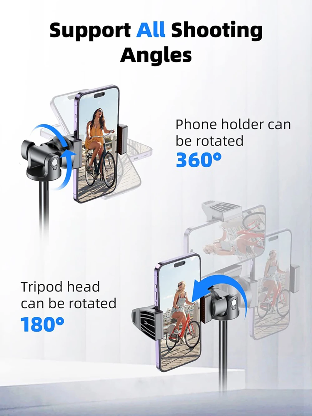 The tripod head is 180° rotational, and the phone holder can 360° adjust. You can set your phone freely at 720° on this iphone tripod and always find the best shooting angle quickly.