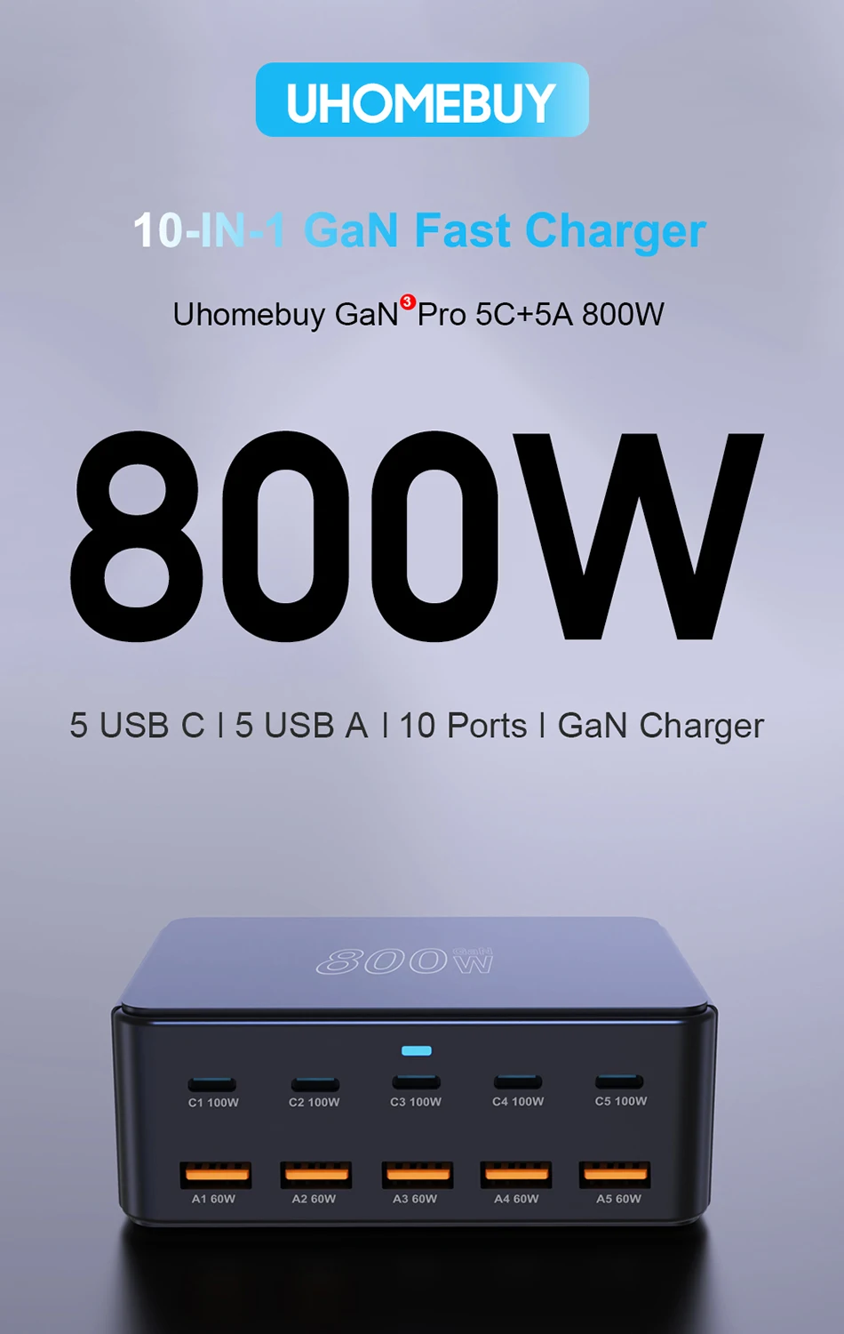 800W USB C GaN Charger 100W PD3.0 PPS QC3.0 Multiport Fast Charging Station for iPhone 15 16 Samsung Macbook Pro Laptops Tablets