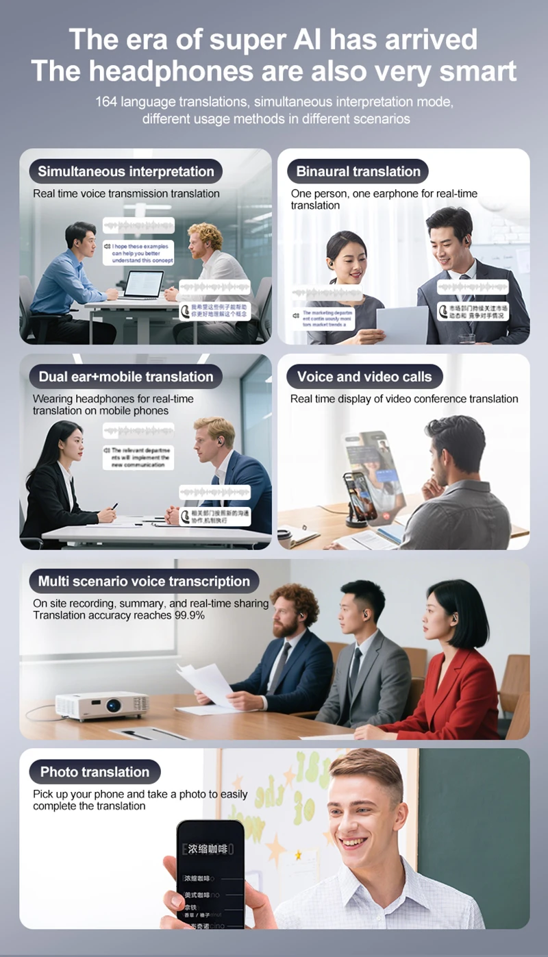 AI Smart Translation Headset Noise Cancelling Wireless Headsets Waterproof Sports Stereo With Mic Bluetooth Earohone