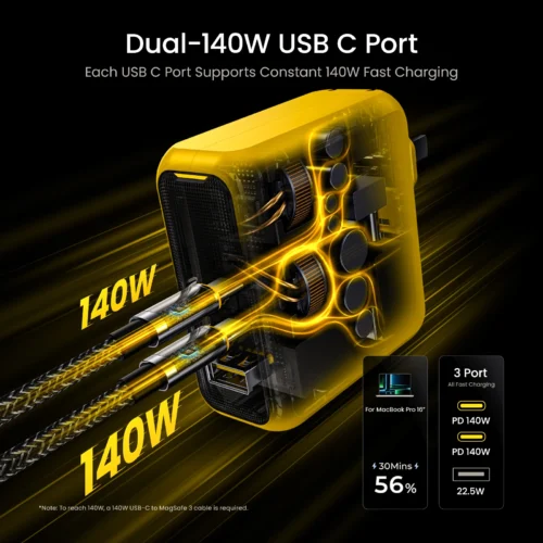 The AOHI Magcube Dual-140W PD3.1 USB-C charger is the first to maintain a 140W output, ensuring your device stays in a stable and constant fast-charging state. This 140W Magcube PD 3.1 GaN+ laptop charger utilizes a PFC+AHB asymmetric half-bridge structure to maintain stable output voltage during charging. Both USB-C ports can support 140W fast charging for the MacBook Pro 16″ (must be used with a USB-C to MagSafe 3 charging cable, not included). It’s a true game changer, delivering the most reliable 140W charging solution in the industry