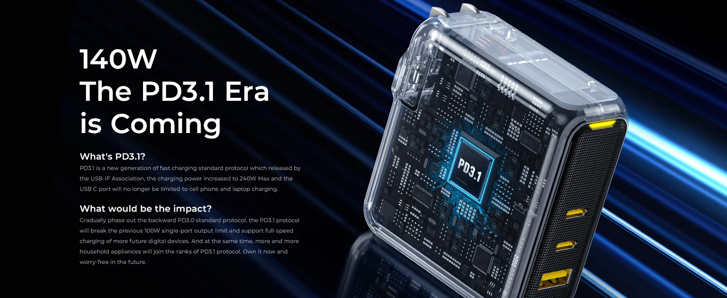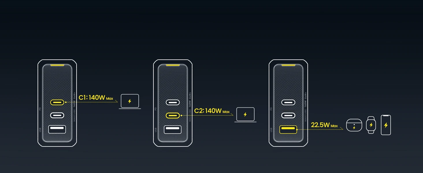 | PD Output | 140W Max Each Port. 5V/3A, 9V/3A, 12V/3A, 15V/3A, 20V/5A, 28V/5A, PPS 3.3-21V/5A |
