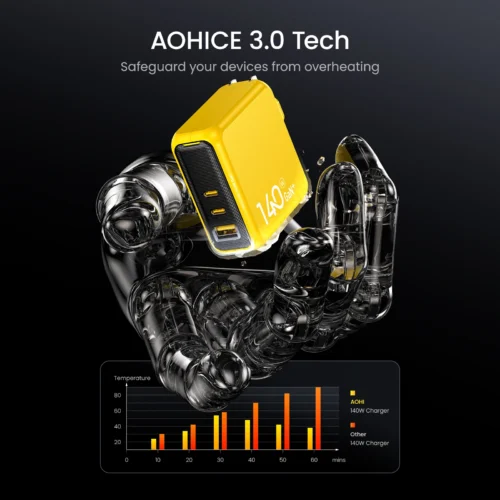 With the newly upgraded AOHICE 3.0 temperature control technology, the AOHI Magcube 140W fast charger has passed 1,070,000 full power overload tests. It supports high power output while ensuring real-time temperature control and rapid heat dissipation, safeguarding your devices from overheating. This technology also ensures long-term longevity and safety for your charger. Unlike the LLC structure used by other 140W chargers, the PFC+AHB asymmetric half-bridge structure used in the AOHI 140W Magcube charger provides a better experience in terms of temperature and charging efficiency