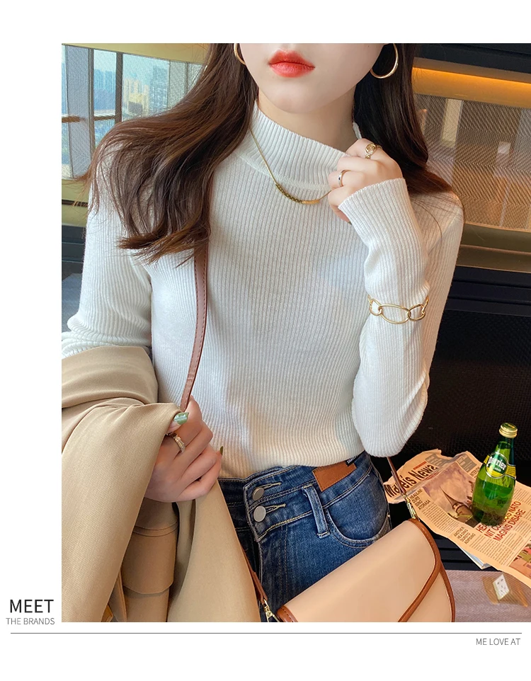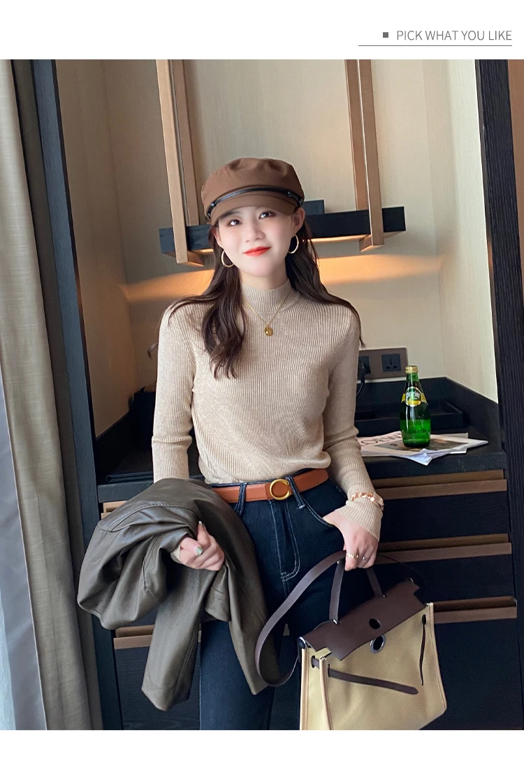 Autumn Winter Mock Neck Women Sweater Vintage Basic Solid Knitted Korean Tops Casual Slim Pullover Sweaters Simple Chic Jumpers