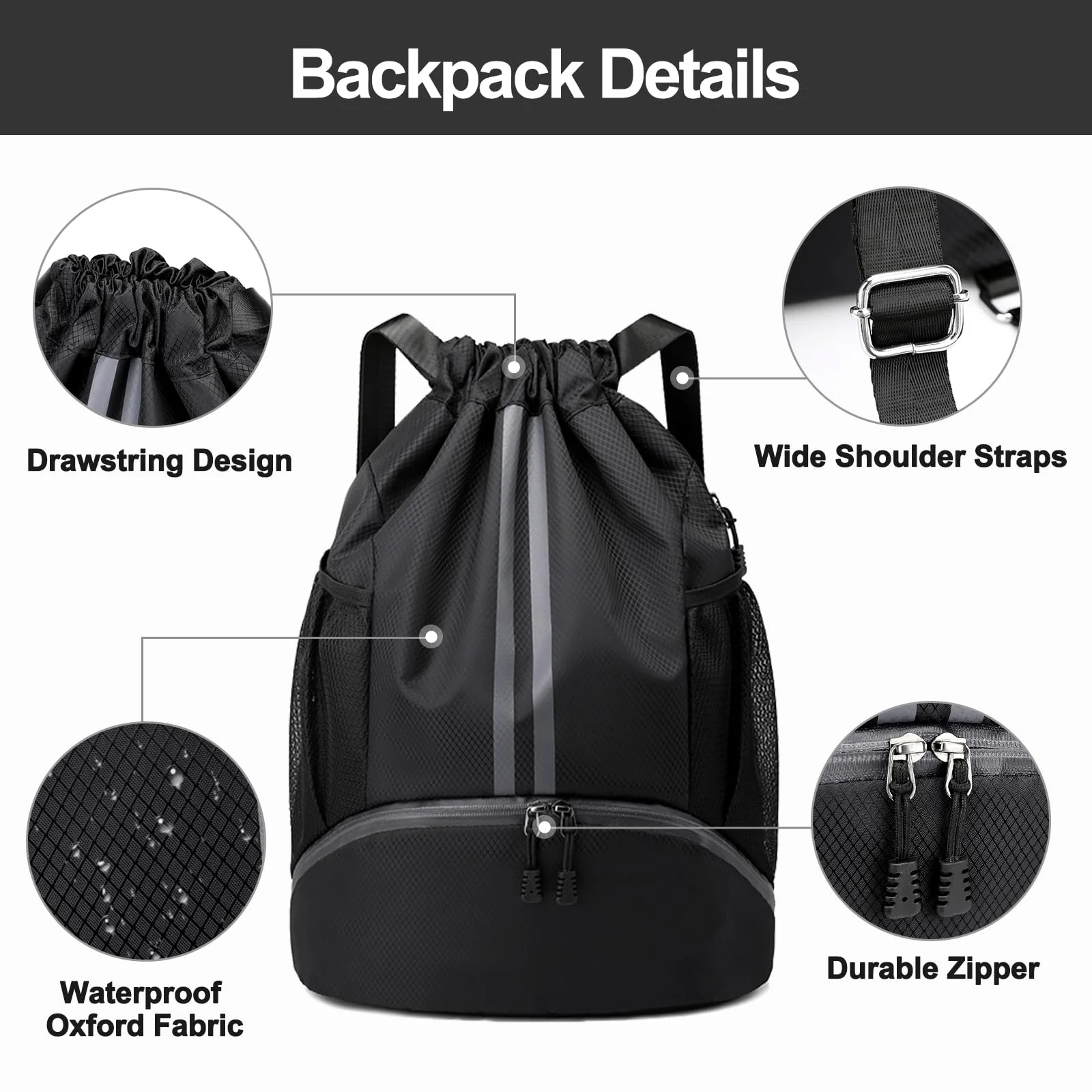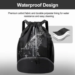 – Water-resistant drawstring backpack suitable for gym and swim activities.