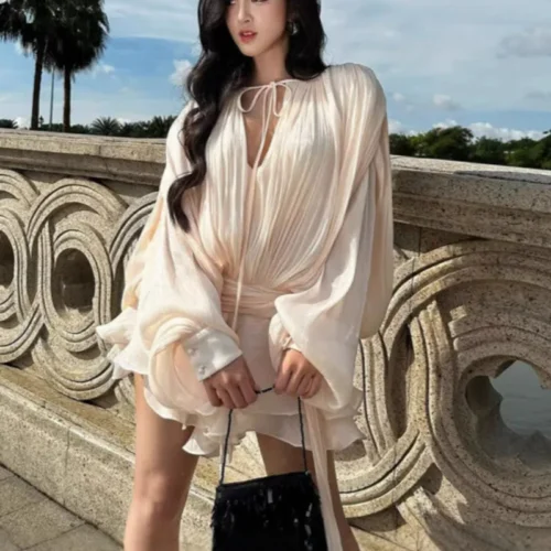 Be the first to review “Beige Top Solid Blouse Mini Dresses For Women V Neck Long Sleeve Spliced Lace Up Sweet Style Dress Female Clothing Fashion P7WI”