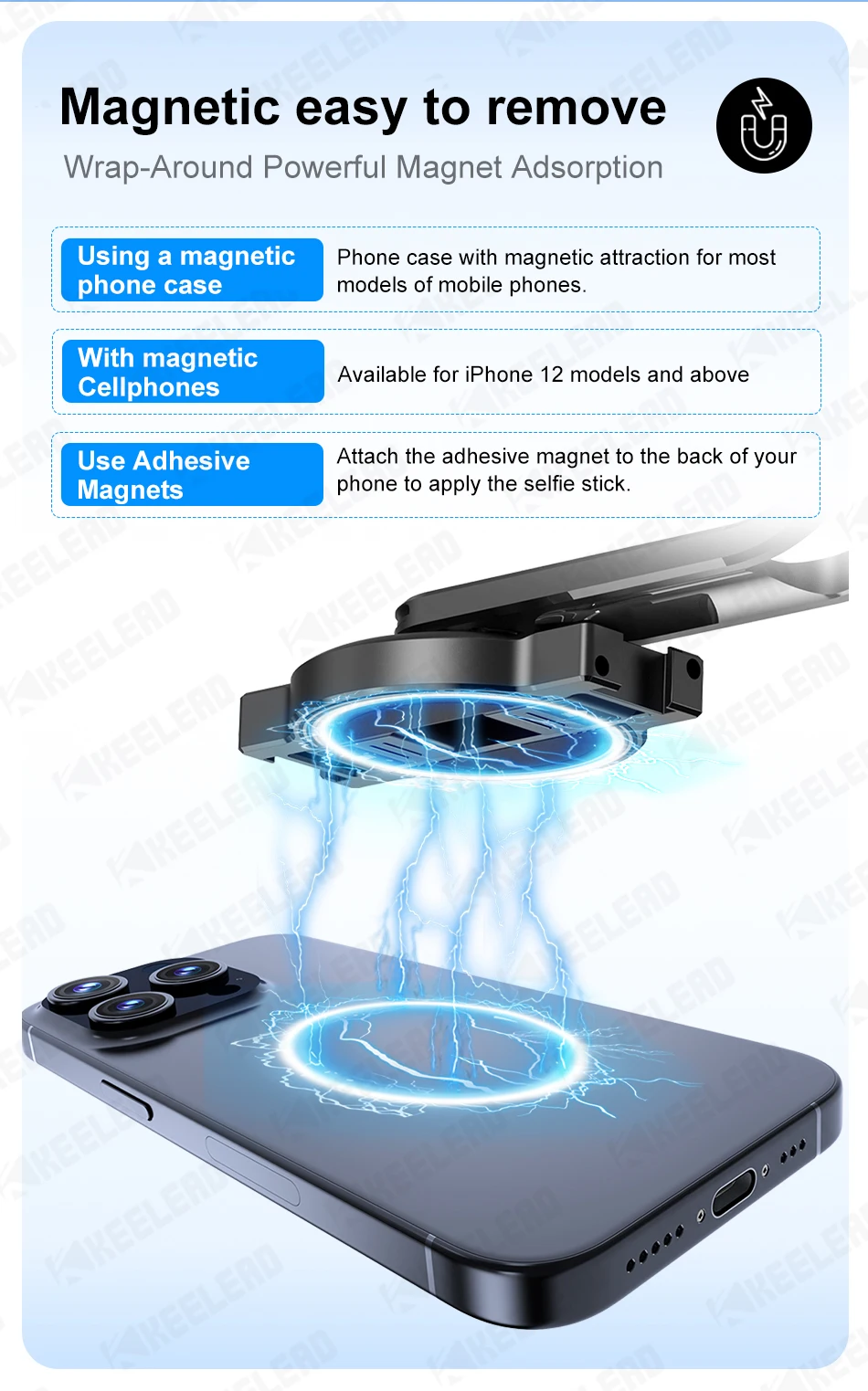 (The magnetic design is suitable for iPhone 12 and above, and phones with magnetic features. If your phone lacks magnetic features, use the clip instead.)