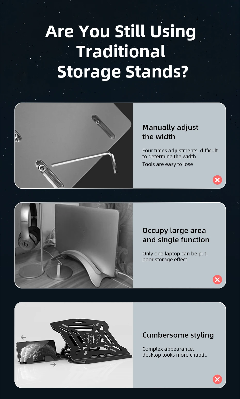 Two laptops(phones and tablets) can be placed on the vertical laptop stand at the same time to create a neat and organized desktop. Also, keep your devices away from any spills