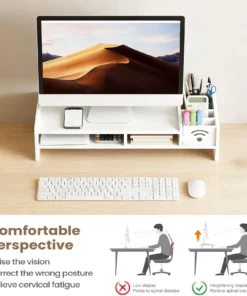 – Desktop computer elevated stand designed for ergonomic comfort and organization.