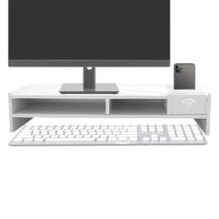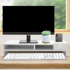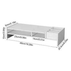 – Three-tier monitor stand designed for ergonomic advantages and organization.