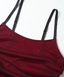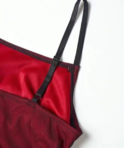 – Women’s dress featuring a red pasta design, pleated skirt, and straps.