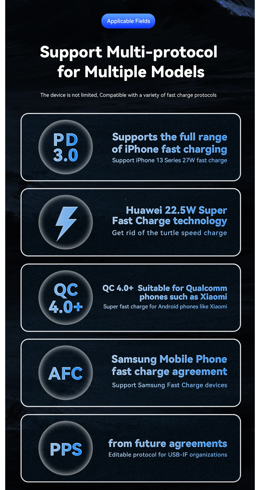 • Qualcomm Quick Charge Protocol :The car charger supports Qualcomm Quick Charge protocol, ensuring fast and reliable charging of your devices, saving you time and enhancing your device’s usage.