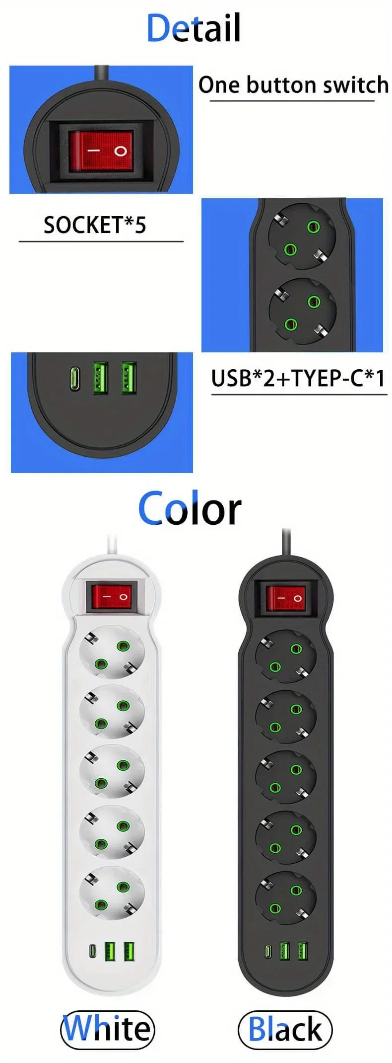 Be the first to review “EU Plug Power Strip 2/3/4/5 Outlet Multitap Extension 10A with 2 USB 1 Type-C Ports 2m Cord Electrical Socket 2500W”