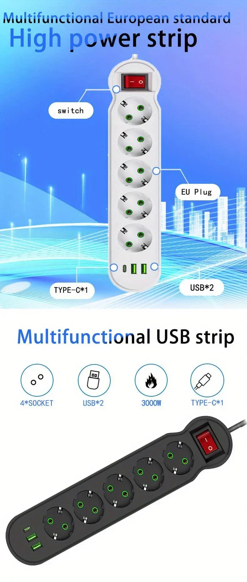 EU Plug Power Strip 2/3/4/5 Outlet Multitap Extension 10A with 2 USB 1 Type-C Ports 2m Cord Electrical Socket 2500W