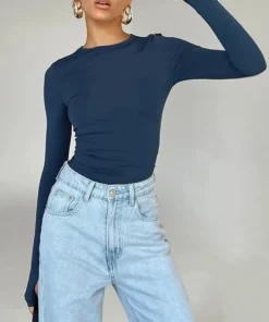 Long Sleeve Crew Neck T-shirt with Thumb Holes for Women – Solid Slim Fit Crop Top for Daily Streetwear