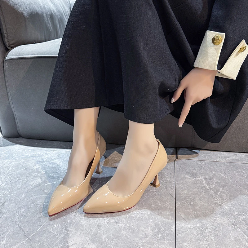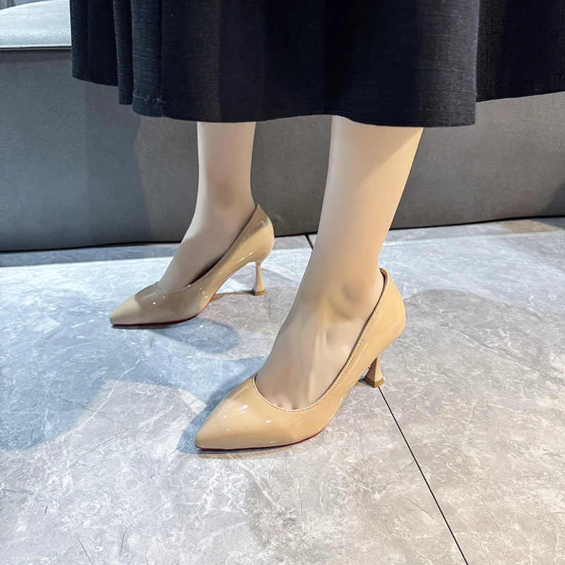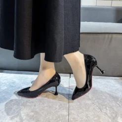 – Women’s pumps made with patent leather featuring thin heels and a pointed toe design.