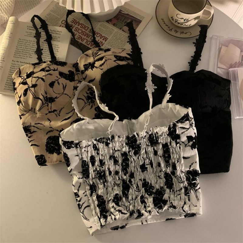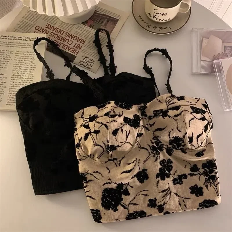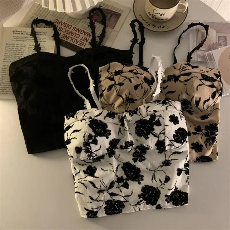 Harajuku Elastic Camisole Women Retro Aesthetic French Style Sleeveless Inside Clothes Floral Lady Summer Casual Crops Popular