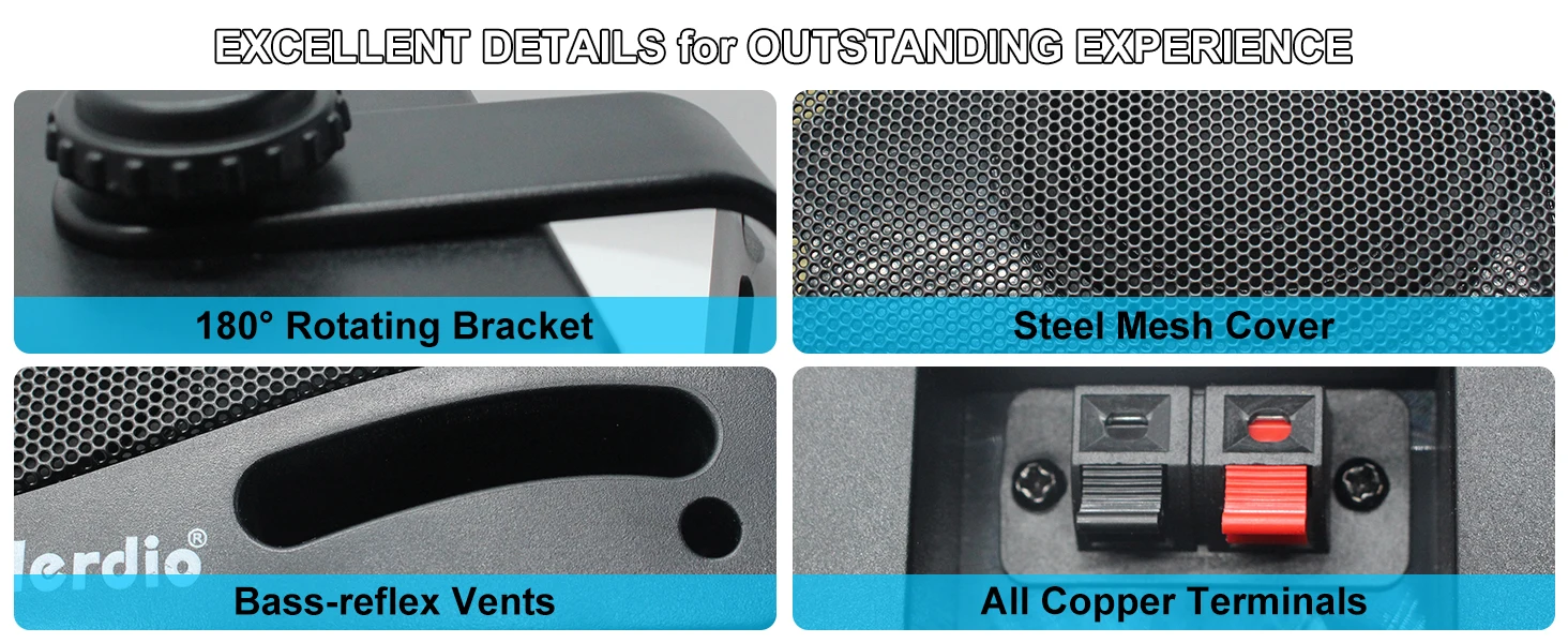 【VERSATILE SWIVEL BRACKETS】We designed easy install 180° swivel brackets to make sure you are able to place all the indoor outdoor speakers in optimal height. The mountable speaker has a quick-lock installation system, which is easy to operate and has an anti-slip design, and suitable for installation in indoor / outdoor scenes, such as patio, home theater, boat, garage, decks, poolside