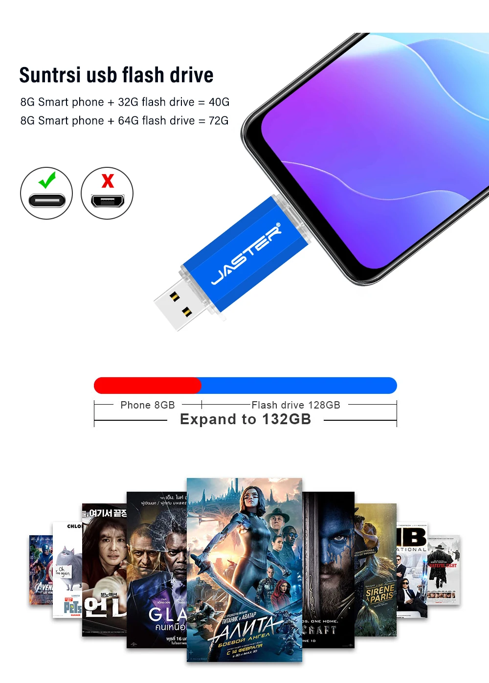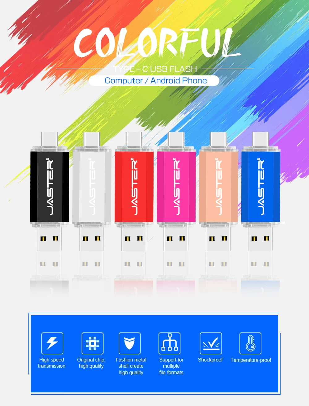 JASTER 2-in-1 OTG USB Flash Drive – 128GB, Type C & Micro USB
