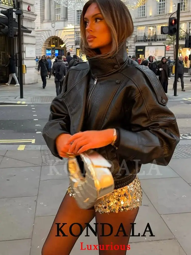 KONDALA Women’s Oversized Black Leather Jacket with Buttons and Long Sleeves