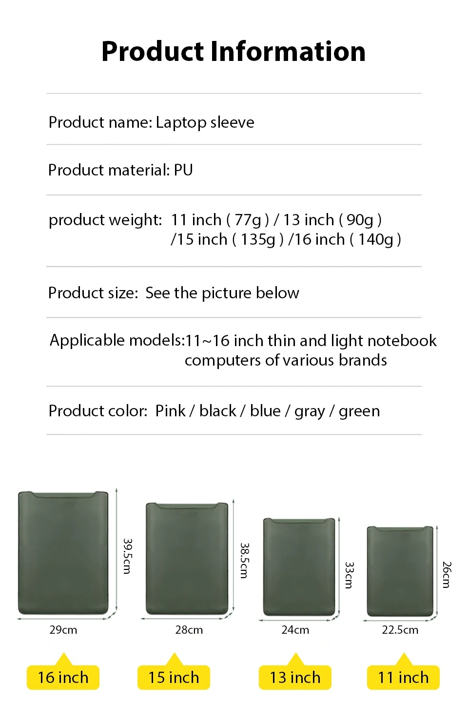 | Size | 11 inch, 13 inch, 15 inch, 16 inch |