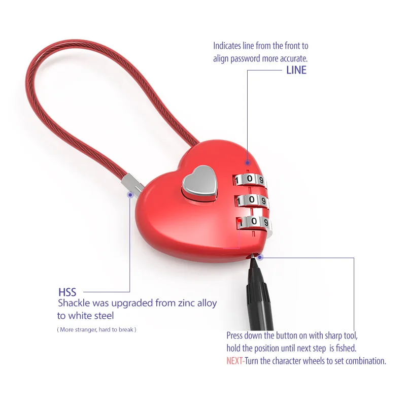 Love Lock Heart Combination Lock – Zinc Alloy for Bags and Trolley Boxes