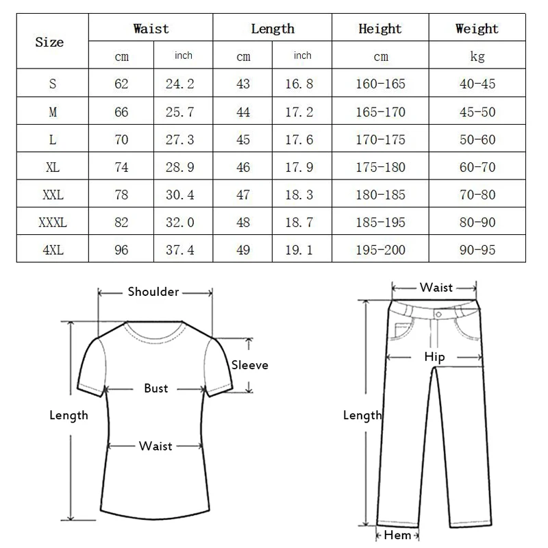 – 4XL: Waist 86cm, Length 49cm, for Weight 90-95kg, Height 195-200cm.