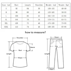 – 3XL: Bust 100cm, Length 73cm, for weight 80-90kg and height 185-195cm.