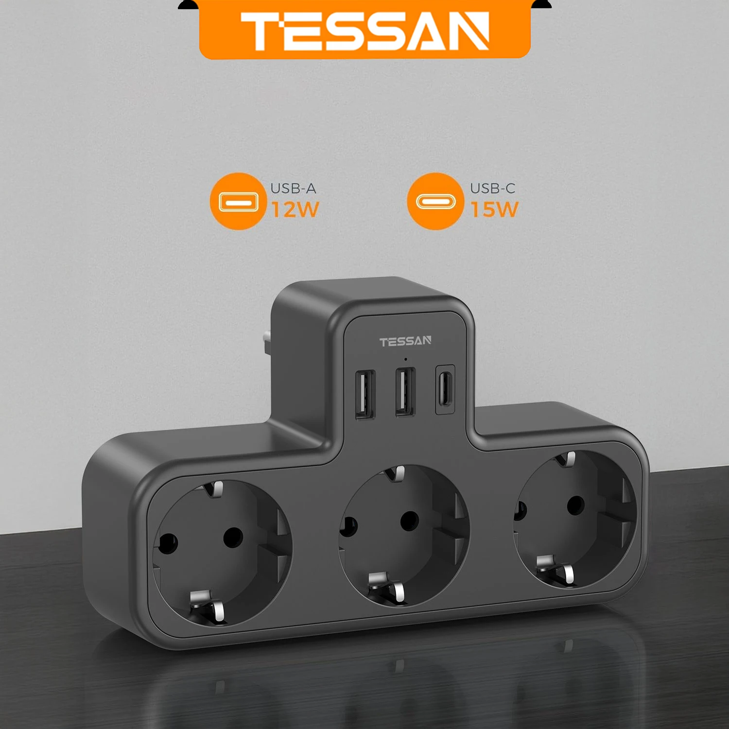 TESSAN EU Plug Power Strip with 3 AC Outlets +2 USB Ports+ 1 Type C, 6-in-1 Plug Socket Adapter Wall Charger for Home Office, Black and Grey