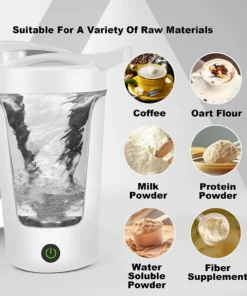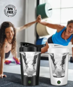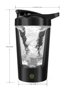 – Electric mixing cup designed for blending protein powder and other beverages.