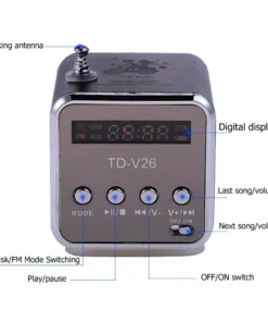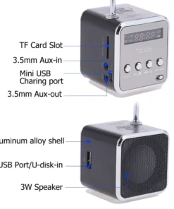 – Mini speaker with Bluetooth support and FM radio functionality.
