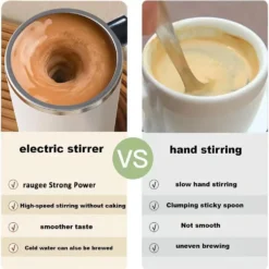 – One-touch self-stirring for smooth blending of coffee, cocoa, or protein shakes.