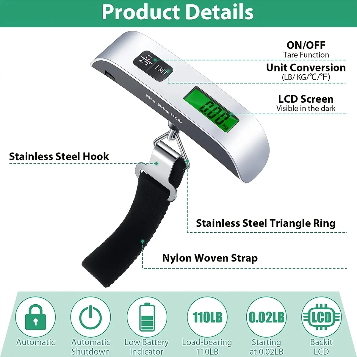 – Electronic hand luggage scale with a capacity of 50kg (110lb).