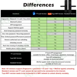 – Unlock methods include fingerprint, password, smart card, key, and app (available in Tuya and TT Lock options).