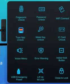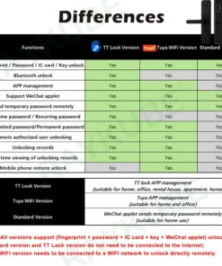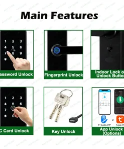 – Unlock methods include fingerprint, password, smart card, key, and app (available in Tuya and TT Lock options).