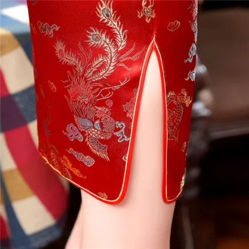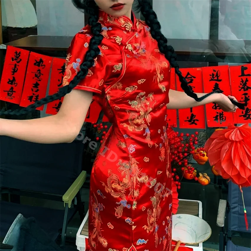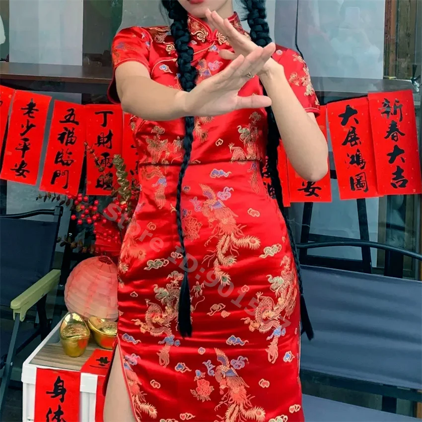 Red Dragon Mini Cheongsam Dress for Women – Satin Vintage Qipao with Mandarin Collar (4XL – 6XL)