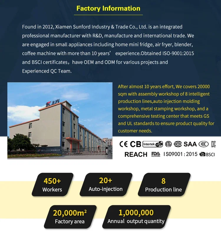 A: We have our own factory and we have our brother suppliers chain, we have 20000 sqm of factory areas, 450 workers, 8 +production lines, 20+ Auto-injection , we can offer you the latest model with most competitive price. We have BSCI and ISO-9001 quality system. Every item will be inspected several times before shipping out with our 10 years’ experiences QC department. Besides most air fryer we made are exquisite as we have galvanized plate inside, so there would be no plastic smell. Hope together we can do a win-win cooperation.