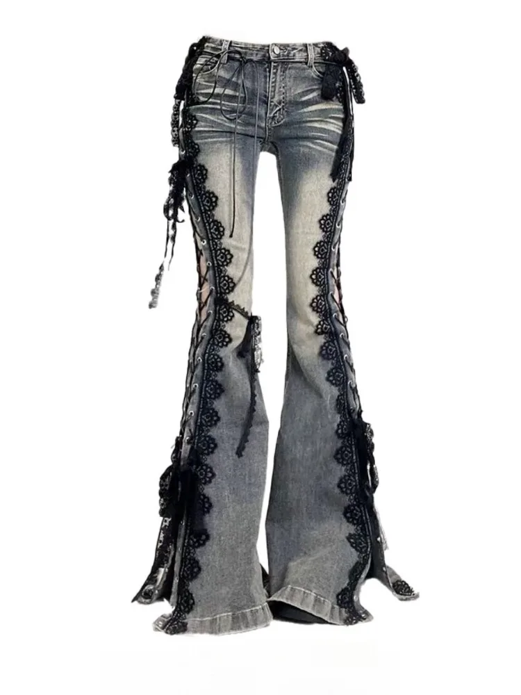 Retro Lace-Up Flare Jeans for Women – Slim Low Rise Bootcut Pants
