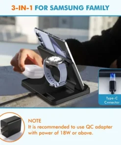 – 3 in 1 wireless charger compatible with Samsung phones, Galaxy watches, and earbuds.