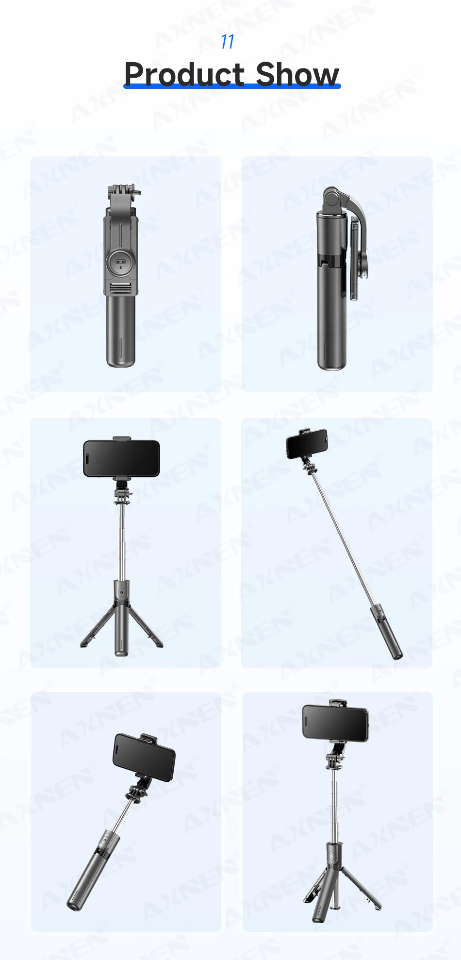 The F01 selfie stick tripod is a 2-in-1 tool for taking photos and videos. It works with most smartphones and action cameras. The stick has 6 extendable sections, a 360° rotating phone holder, and a detachable Bluetooth remote. It is very light and easy to carry, perfect for travel, vlogging, and everyday use.