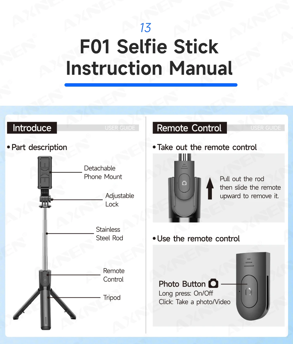| Model Number | F01 Selfie Stick Tripod with Detachable Bluetooth Remote |