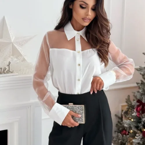 Be the first to review “Shirt Top Women Sheer Patchwork Turn Down Collar Single Breasted Full Sleeve Blouses Tops Autumn 2025 Office Lady Overshirt”